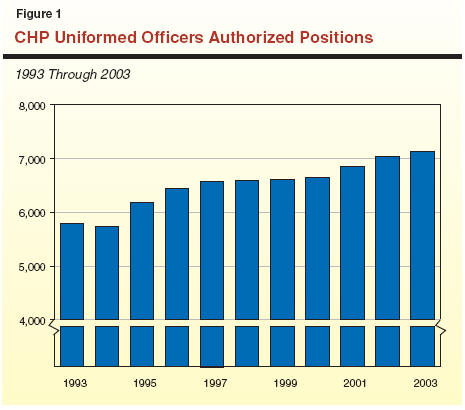 Recent Personnel Growth Largely in Nonpatrol Programs . . . As Figure 1 displays, CHP's uniformed staffing levels have increased considerably in the past decade. In 1993, a department-wide hiring freeze limited CHP to 5,800 uniformed personnel, including about 4,200 personnel for road patrol duties. The following year, the Legislature authorized an increase of 500 uniformed staff over a three-year period. In 1995, CHP added 270 additional protective service positions as a result of the consolidation with the California State Police. The number of uniformed staff also grew in the 1990s due to workload increases in the vehicle inspection and theft programs. As a result of the September 11, 2001 attacks, over 300 additional uniformed positions were added for homeland security duties such as protecting bridges and serving on various antiterrorism task forces.