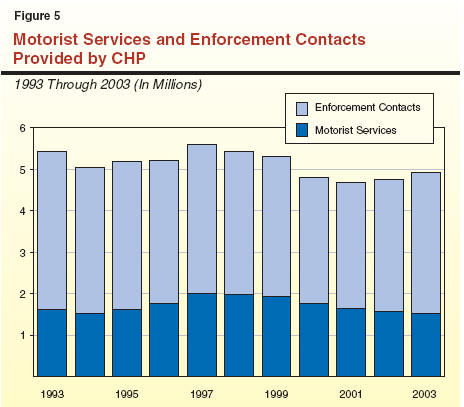 As a result of the reduction in proactive patrolling, the overall level of traffic services and enforcement that CHP provides to the public has fallen, as displayed in Figure 5. Since the late 1990s, the number of motorist services performed by road patrol officerswhich includes aiding stranded motorists and removing hazards from the roadwayshas decreased by over 20 percent. In addition, the combined number of enforcement contacts (arrests, citations, and written and verbal warnings) initiated by officers in recent years is below levels the department achieved throughout most of the 1990s.