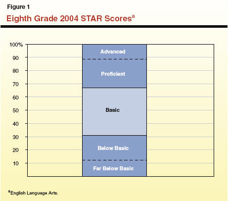 Students begin high school with very different levels of achievement. Figure 1 (see next page) displays the percentage of eighth grade students scoring in the five proficiency levels on the Standardized Testing and Reporting (STAR) English Language Arts test. About one-third of students score in the top two levels-proficient and advanced. About the same proportion scores in the basic category and in the bottom two levels combined-below basic and far below basic. Since the state’s goal is for all students to score in the proficient or advanced levels, Figure 1 shows that about two-thirds of eighth grade students are failing to meet this goal.