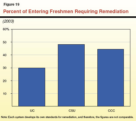 Figure 19 displays the proportion of high school graduates enrolling in higher education who were assessed as needing remedial instruction in 2002‑03. For UC, 30 percent of students needed remedial instruction in reading and writing. Almost 50 percent of CSU freshmen needed remedial coursework in English (and about 35 percent in mathematics). For community college students, more than 40 percent of entering freshmen needed to retake at least one basic skills course.