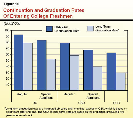 Figure 20 also shows the same rates for students who are accepted as specially admitted students into UC and CSU. Despite not meeting all of the regular admission criteria, the universities found that these students merited acceptance because of economic disadvantage or due to special athletic or other talents. As the figure shows, continuation and graduation rates of special admits are significantly lower than for other students in UC and CSU.