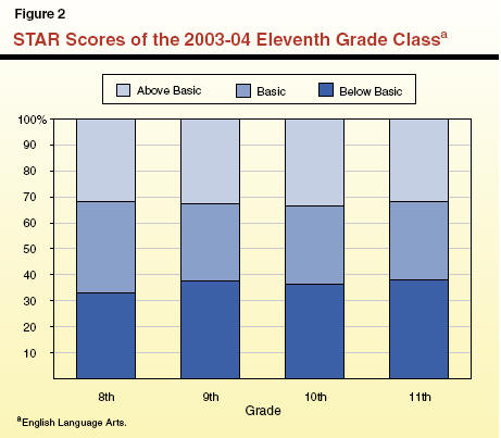The real test for high schools is not where students start in ninth grade but the improvement made while in high school. One way of measuring this “value added” is by examining the progress of the same group of students over time. Figure 2 shows the STAR scores in grades 8 through 11 for the cohort of students who were in eleventh grade in 2003‑04 (that is, the eighth grade scores are from 2000‑01, the ninth grade scores are from 2001‑02, and so on). As the figure shows, there is very little change over time in the proportion of students scoring in the three levels.