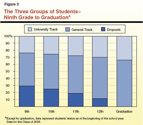 The figure shows that, upon graduation, the university track accounts for one-third of students who remain in school. As a proportion of entering ninth graders, however, the university track comprises only one-fourth of all students. As students in the class drop out of school, this group represents a larger proportion of the remaining students.
