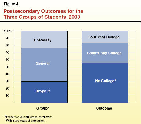 Figure 4 also provides a sense of what happens to students in the three groups immediately after high school. Assuming all students in the university track go to college after graduation, about 70 percent of this group attends four-year colleges and about 30 percent attends CCC or attend college in another state. Figure 4 also suggests that a significant proportion-about 40 percent-of the general track enrolls in CCC. The remainder of the general track and dropouts do not enroll in college.