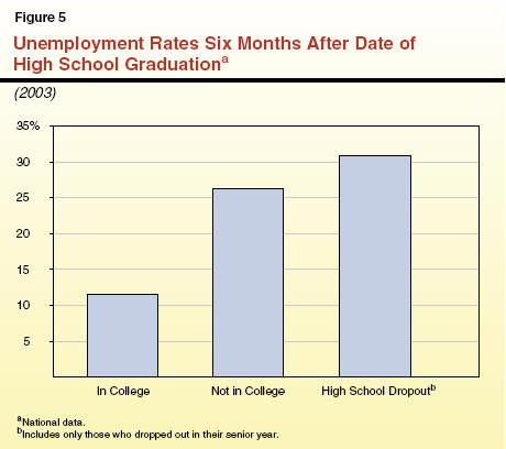 Most of the 55 percent of students who do not attend college after graduation enter the labor force. Unemployment data suggest a difficult transition to the labor market for many of these students. Figure 5 displays national data on the unemployment rates of students six months after they graduated (or would have graduated if they had not dropped out of school). A total of 19 percent of recent graduates were unemployed, which is defined as actively seeking work, but unable to find a job. For graduates enrolled in college, 12 percent were unemployed. For graduates who were not in college and for students who dropped out during their senior year, unemployment rates were significantly higher-26 percent and 31 percent respectively. These figures do not include “discouraged workers,” who are not employed but have given up looking for a job.