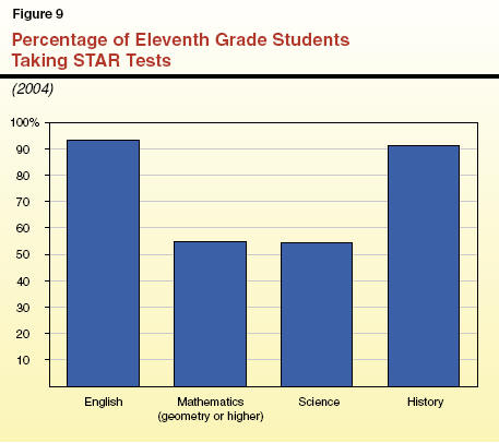 Figure 9 illustrates this situation. The figure displays the proportion of eleventh grade students taking STAR tests in the four content areas in 2004. Over 90 percent of students took the history and English tests. By comparison, only about 55 percent of eleventh graders took an advanced mathematics test (geometry or higher) or one of the four STAR science courses.