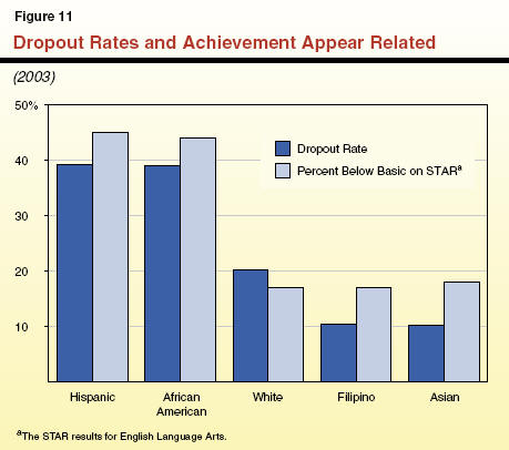It is important to understand the significance of these data. Since 12.5 percent of high school graduates are eligible for admission into the University of California (UC), the 11 percent of students scoring in the advanced level are scoring at levels roughly consistent with UC’s admission standards. At the other end of the performance scale, about 12 percent-roughly 60,000 students-scored far below basic. Scores at this level are equivalent to randomly guessing at the answers to test questions. The difference between the advanced and far below basic levels, therefore, represents a major achievement gap. (For the remainder of the report, we simplify the STAR testing data by consolidating the top two STAR performance levels into “above basic” and the bottom two levels into “below basic.”)