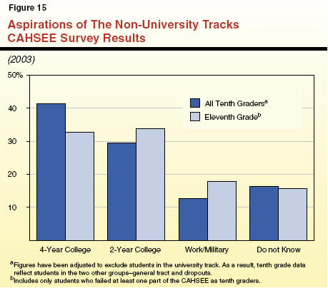 The CAHSEE, however, does little to improve the achievement of students in the university track because the test measures skills most students in the university track master well before tenth grade. The BOARS report, however, suggests that admissions tests can have powerful effects on student achievement and the K-12 education system. As a result, using a standardized measure of high school achievement for postsecondary admissions and placement could direct these powerful incentives in a direction that supports K-12 education rather than weakening it.