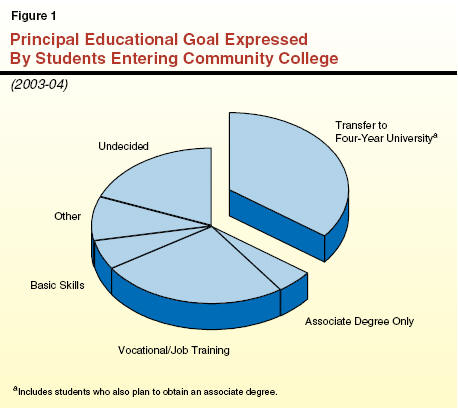Many CCC Students Initially Want to Transfer... Students enrolling at a community college for the first time are asked to identify their principal education goal on their application. Figure�1 summarizes the proportion of first-time students in 2003-04 choosing particular educational goals when they entered the community college system. As the figure shows, about one-third of the students indicate that they would like eventually to transfer to a four-year university. We note that some students who do not indicate transfer as their initial goal may later change their plans and seek transfer to a four-year university.