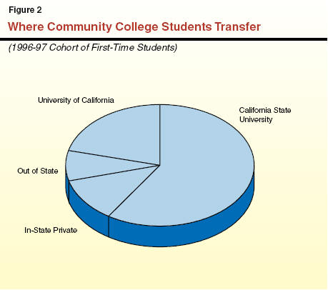 �But Few Students Actually Transfer. Although many students enter community college with the expressed goal of transferring to a four-year university, many do not meet that goal. Currently, the CCC Chancellor�s Office does not regularly track the outcomes for students who indicated on their application that they would like to transfer to a four-year university. As a proxy, the Chancellor�s Office assumes students intend to transfer when they (1) attempt transfer-level math or English and (2) complete at least 12 units at a CCC within six years. About 35�percent of first-time students that entered community college in 1996-97 met this definition. (This includes students that may not have indicated a goal to transfer on their application.) The Chancellor�s Office reports that about 43�percent of these �intent to transfer� students actually transferred to a four-year university within six years. (This rate reflects an increase compared to the transfer rate of similar students that entered community college in the previous three years, which was roughly 30�percent.) The Chancellor�s Office asserts that its definition of intent to transfer screens out students attending for brief remediation, English language instruction, or other nondegree pursuits, and allows for an accurate measure of �value-added� by the community colleges. However, such a definition most likely overestimates the transfer rate because it excludes from the base students who expressed an initial goal of transfer but for whatever reason did not complete certain courses. Alternatively, some measurements of transfer rates include all first-time student�s in the base-not just those with intent to transfer. Under this definition, the CCC�s transfer rate has been about 19�percent.