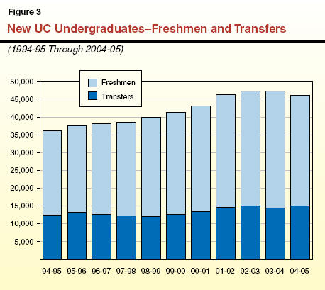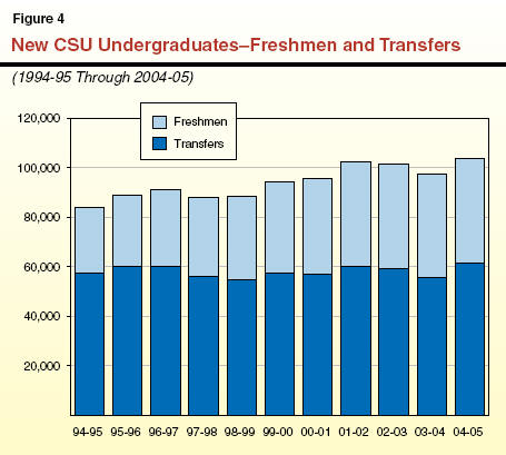 During the past decade, the number of new transfer students at UC and CSU has fluctuated modestly. As Figures 3 and 4 show, in recent years about 15,000 community college students have transferred annually to UC and almost 60,000 have transferred to CSU. The figures also show the proportion of new undergraduates that entered the universities as transfer students and freshmen (recent high school graduates) for each of the past ten years. As displayed in Figure�3, less than one-third of UC�s new undergraduates were comprised of transfer students. This means that a majority of students entered UC at the freshman level. In contrast, a sizable majority of CSU�s new undergraduates have consistently been transfer students (see Figure�4). For example, transfer students comprised about two-thirds of CSU�s entering undergraduate class in 2004-05.