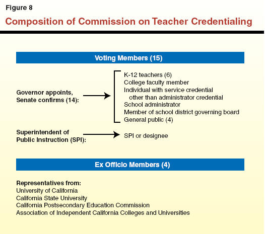 An Independent Commission. The existing commission is an independent, statutorily authorized body. Figure�8 shows the composition of the commission. As shown, the commission has 15 voting and 4 nonvoting members. Unlike many other state agencies, the executive director of the commission is accountable only to the commission and does not report directly to the Governor. The commission initiates teacher-related policies and approves teacher-related regulations.