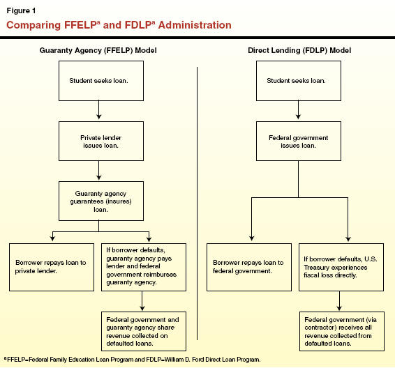 As shown in Figure�1, the major difference between FFELP and the direct loan program is in how the federal government finances and administers them. Administration of FFELP is decentralized-relying on private lenders and state guaranty agencies to operate the program for the federal government. By comparison, administration of the direct loan program is centralized-colleges work directly with the federal government and loans are funded directly from the U.S. Treasury. Colleges themselves select which program to use, though they can participate in both programs as long as no student receives a loan from both programs for the same enrollment period. Because state-level agencies have no role in the direct loan program whereas states must have a designated guaranty agency that administers FFELP, the remainder of this report focuses only on FFELP.