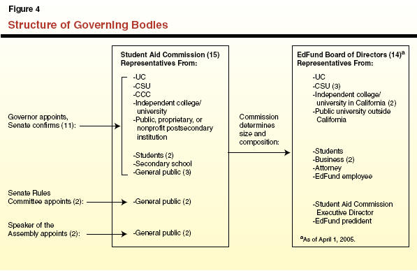 Separate Governing Bodies has Led to Tension Among Organizational Leadership. In our opinion, one of the major shortcomings of the existing structure stems from its competing governing bodies. Figure�4 shows the composition of these governing bodies as of April 2005. As reflected in the figure, state law specifies that CSAC is to be governed by a 15-member commission and entrusts the commission with nominating and appointing a board of directors for its auxiliary agency. The commission is given broad authority to determine both the size and composition of the board. Furthermore, EdFund�s bylaws permit the commission to remove any individual serving on the board at any time, with or without cause. Despite being given no ultimate, independent authority, EdFund is assigned (both by law and its operating agreement) major operational responsibilities. This has created considerable tension between the two agencies since the inception of EdFund.