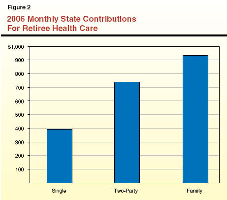 2006 State Contribution Levels. Legislative approval of funding for retiree health and dental benefits occurs in the budget act, following CalPERS� negotiation of health plan rates for the upcoming calendar year. For 2006, the 100/90 formula contributions are based on the premium costs for the four largest CalPERS health plans: Blue Shield�s health maintenance organization (HMO), Kaiser Permanente�s HMO, the PERSCare preferred provider organization (PPO), and the PERS Choice PPO. This results in a 2006 required state contribution of $394 per month for a single retiree, $738 per month for a retiree and a family member, and $933 per month for a retiree family, as shown in Figure�2.