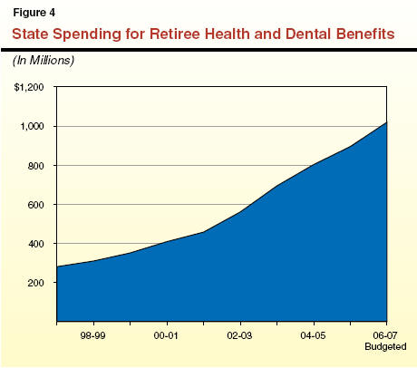 Figure�4 shows that state costs for retiree health and dental benefits have increased rapidly in recent years. They have more than tripled in the last nine years, reaching $895�million in 2005-06. The 2006-07 Governor�s Budget projects that retiree health and dental costs will exceed $1�billion in 2006-07. Since 2000-01, retiree health expenditures have increased an average of 17�percent annually, or more than five times the rate of growth of state spending.