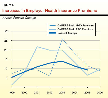 Employer Health Premiums Rising Even Faster. In recent years, employer health premiums-such as those negotiated for the state by CalPERS-have risen even faster than the rate of overall medical expenditures. Employers� expenditures to purchase health coverage reflect the general costs of medical care, other costs associated with a private insurance market (insurer reserves, the pricing of pooled risk, and a return on capital), and the health care industry�s shifting of costs not paid by the large, but typically unprofitable, Medicare and Medicaid programs. As shown in Figure�5, the state�s premiums in most recent years have risen faster than the national average for public and private employers. The growth each year, which is determined by annual negotiations with health plans, can be quite volatile. Some recent years have seen double-digit increases.