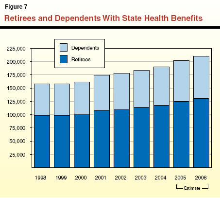 We estimate that 35�percent to 45�percent of the state�s active workforce will retire within the next ten years. Assuming this level of retirements and retirees� increasing longevity, we forecast that the number of retirees and dependents covered by the state�s health program will increase by almost 4�percent annually through 2010-11. This trend, combined with continued premium growth, results in our projection of continued double-digit growth in the cost of state retiree health and dental benefits. We project that these costs will increase from $1.0�billion in 2006-07 to $1.6�billion in 2010-11.