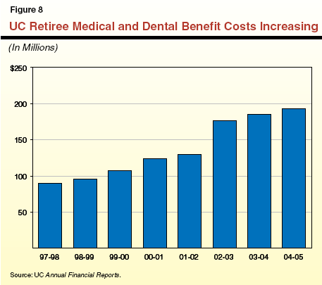 Costs Growing Rapidly. In 2004-05, UC retiree health and dental benefit costs totaled $193�million, or 1�percent of total university revenues. Between 1997-98 and 2004-05, as illustrated in Figure�8, these costs grew an average of 12�percent annually. The UC retiree population grew at a rate of 2.2�percent annually during this period.