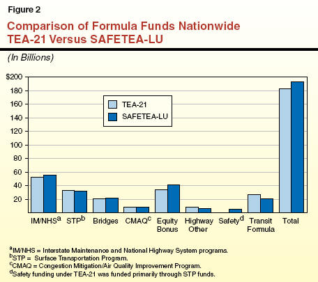 Program Structure Relatively Unchanged, but Increases Focus on Safety. As with TEA-21, the new act directs federal funding for highways and transit. In the highway program, there continues to be six major formula funding categories-Interstate Maintenance, National Highway System, Congestion Mitigation/Air Quality Improvement (CMAQ), Surface Transportation Program (STP), Bridges, and Equity Bonus (known as Minimum Guarantee under TEA-21). In the transit program, a mixture of formula and discretionary grants is provided through the Urban Formula, Fixed Guideway Modernization, New Starts, and High Priority Bus categories.