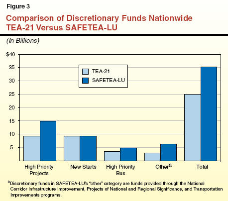 In contrast, Figure�3 shows that SAFETEA-LU provides about $35�billion in discretionary funding nationwide-about 40�percent more than the amount under TEA-21. In particular, funding for the HPP program increases from $9.3�billion to $14.8�billion. The act also creates three new discretionary grant programs for NCIIP, PNRS, and TI.