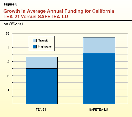 Overall Funding to State Increases. California�s apportionment of federal transportation funds under SAFETEA-LU will be substantially higher than under TEA-21. This is because of both the increase in the nationwide funding authorization and the higher rate of return to donor states on fuel tax contributions. According to the Department of Transportation (Caltrans) and federal estimates, the act will provide $23.4�billion in transportation funds to California from 2005 through 2009. Of this amount, about $18�billion will go to highways, $5�billion will go to transit, and $452�million will go to safety improvements. This represents a 40�percent increase in average annual funding over TEA-21. Figure�5 compares average annual funding for California by mode under the two acts. As the figure shows, average annual highway authorizations are 44�percent higher and average annual transit authorizations will grow by a third over the span of SAFETEA-LU.