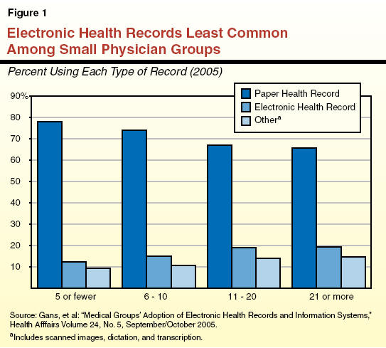 Despite the acknowledged potential benefits of HIT systems, adoption so far has been limited. Only an estimated 15 percent of physicians nationally use EHRs, and small medical practices are less likely to have implemented EHRs than larger practices, as illustrated in Figure 1. Communities with RHIOs under development or in operation number perhaps in the low hundreds nationally, with most of these in some stage of development short of actually implementing a health information exchange (HIE).