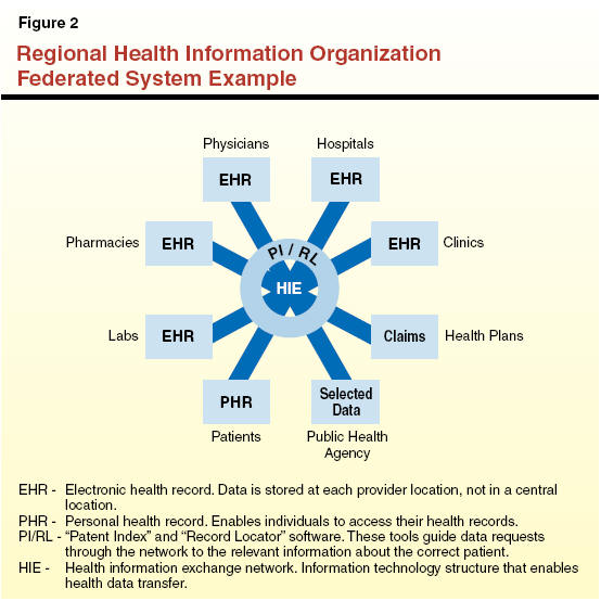 - Federated Systems. Under this approach to sharing medical data, each participating health entity, such as a doctor’s office, hospital, or lab, stores the data pertaining to its patients on its own separate computer systems. These individual systems are then linked by a computer network that allows users to search for health records on each of the other systems using patient indexing and record locator software. Each participating health entity can maintain different computer programs at its own location as long as those programs can communicate with each other. An example of a hypothetical federated RHIO is shown in Figure 2.