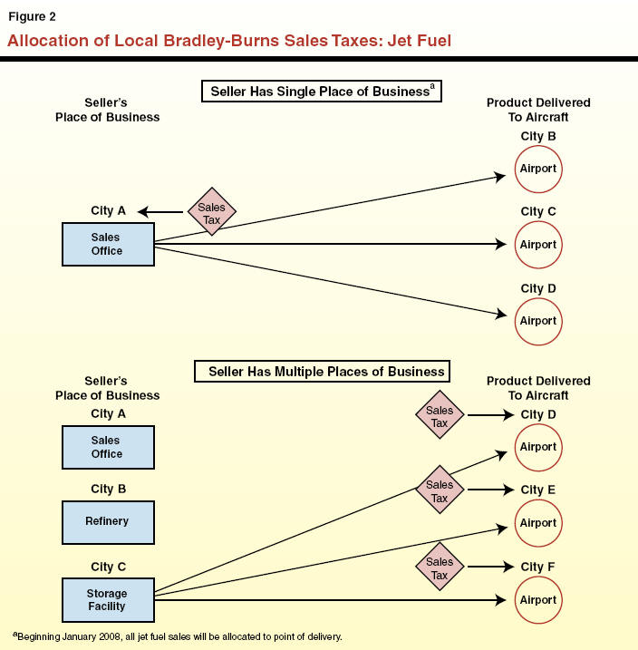 State law provides special allocation rules for jet fuel (see Figure 2). Under these rules, if the seller has just one place of business in California, then the sales taxes on jet fuel are allocated in the same manner as other commodities-to the jurisdiction of the seller. However, if the seller has more than one place of business in this state, then the sales are allocated to the point of delivery to the aircraft. The point-of-delivery rules for jet fuel are the result of Chapter 1027, Statutes of 1998