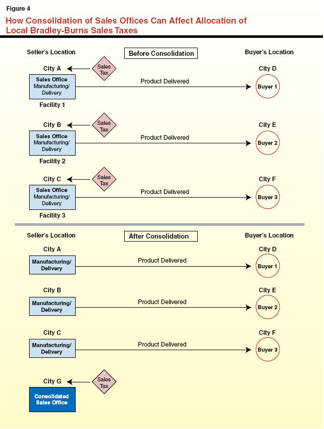This involves an incentive payment to a business that locates a sales office in a community. As noted earlier, in cases where companies have multiple operations in California, sales taxes are allocated to the place where the principal sales negotiation takes place. For some businesses, such as cement manufacturers, Internet or mail order franchises, or suppliers of large computer systems, the sales offices may be located with other operations of the business or may be located in a separate location. If a company that has multiple places of business decides to consolidate all of its sales into just one office, the local jurisdiction which has that consolidated office can benefit from all the statewide sales of the business (see Figure 4).