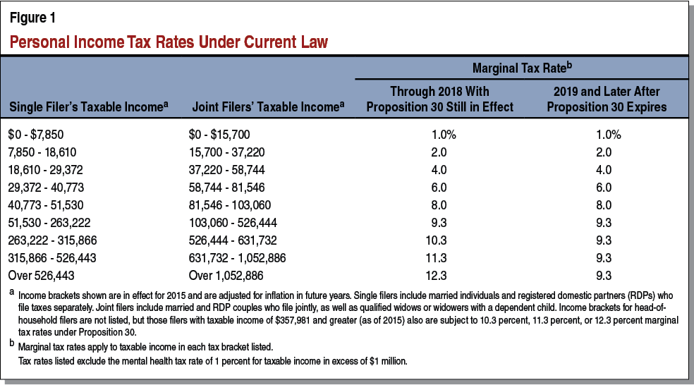 Proposition 30. Proposition 30, passed by voters in 2012, temporarily raised some state taxes. That measure increased the state sales tax rate by one-quarter cent from 2013 through 2016—an increase that is budgeted to generate $1.6 billion of revenue this year. From 2012 through 2018, Proposition 30 increased marginal income tax rates paid by roughly the 1 percent of tax filers in the state with the highest incomes—increases that are budgeted to generate $6.8 billion of revenue this year. (The actual total may be hundreds of millions of dollars or more above or below $6.8 billion.) Figure 1 summarizes income tax rates under current law, including Proposition 30’s temporary tax increases. After Proposition 30 expires, current law provides for a 9.3 percent top marginal income tax rate (not counting a 1 percent tax rate on taxable income in excess of $1 million for mental health programs).