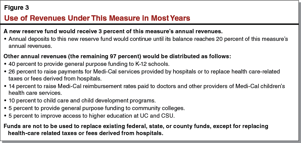Use of Revenues in Most Years. The revenues generated by this measure’s income tax rate increase would be deposited to several new state special funds. In most years, these revenues would have to be used for specified purposes, as summarized in Figure 3.