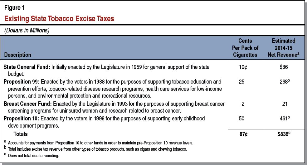 The state’s cigarette excise tax is currently 87 cents per pack. Figure 1 describes the different components of the per-pack tax. As the figure shows, two voter-approved measures—Proposition 99 in 1988 and Proposition 10 in 1998—are responsible for generating the vast majority of tobacco excise tax revenues. As the figure indicates, total state revenues from existing excise taxes on cigarettes and other tobacco products were just under $840 million in 2014-15.