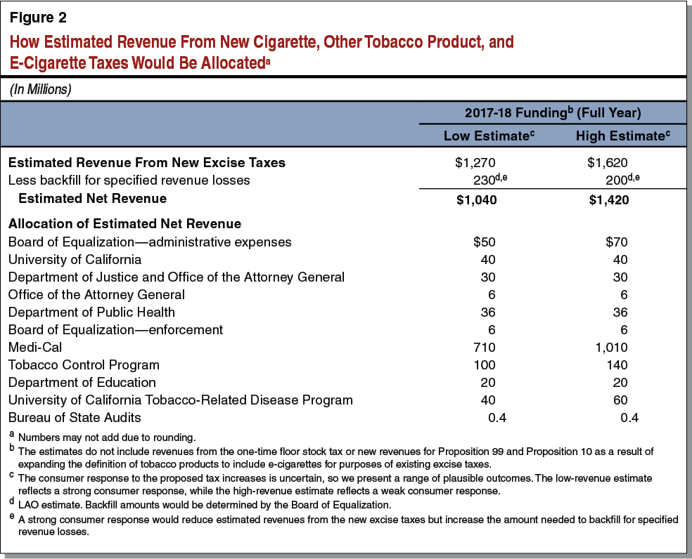 Revenues From New Excise Taxes. We estimate that the new excise taxes on cigarettes and other tobacco products (including e-cigarettes) required by this measure would raise an estimated $1.3 billion to $1.6 billion in annual revenue. The range reflects the uncertainty of the magnitude of the consumer response to the proposed tax increase discussed above. Our estimate of the allocation of new excise tax revenues in 2017-18 (the first full-year impact) is shown in Figure 2. After backfilling losses in existing tax revenue (described in more detail below), the new cigarette excise tax would generate an estimated $1 billion to $1.4 billion in net revenue in 2017-18 for the purposes described in the measure. (These estimates do not include additional revenue from the provision of the measure that expands the taxpaying base of existing excise taxes to include e-cigarettes, which we discuss below. They also do not include revenue from the one-time floor stock tax.) The excise tax increases would generate somewhat lower amounts of revenue in subsequent years, based on our projections of continued declines in cigarette consumption.