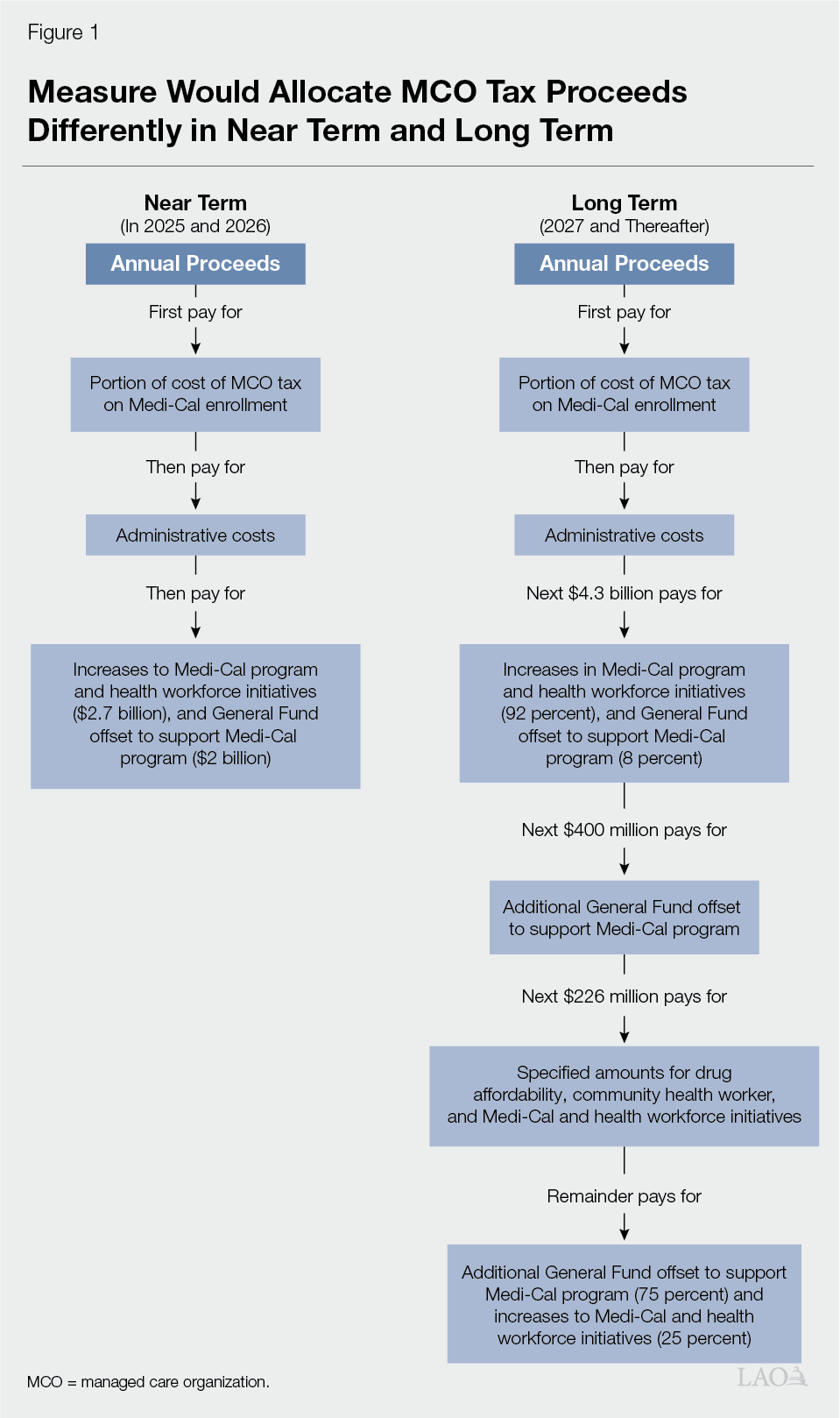Establishes Specific Uses for the MCO Tax Proceeds... In addition to permanently establishing the tax, the measure would specify how the state could spend the resulting proceeds. As Figure 1 shows, the measure sets forth different ways to spend the funds in the near term (through 2026) and the long term (beginning in 2027). In some respects, the two approaches are similar. For example, in both the near term and long term, funds first would be used to cover a portion of MCOs’ cost of the tax associated with Medi-Cal enrollment, as well as certain administrative costs. Also in both approaches, remaining proceeds would be used to offset General Fund costs in Medi-Cal and expand support for Medi-Cal and other health programs. For example, the measure would provide funds to increase payments for certain groups of providers in Medi-Cal. However, how funds would be allocated for each purpose would differ in the near term compared to the long term, described further in the next paragraph.