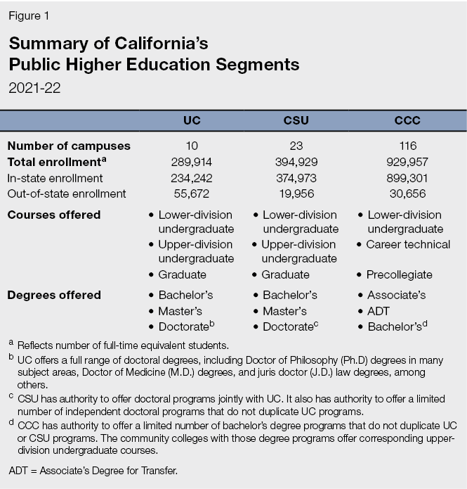 California Has Three Public Higher Education Segments. These segments are UC, the California State University (CSU), and the California Community Colleges (CCC). In 2021-22, these three segments together educated a total of 1.6 million full-time equivalent students. Figure 1 provides basic information about each segment. As the figure shows, CCC has the most campuses as well as the highest enrollment. CCC focuses primarily on instruction through the lower-division undergraduate level. Its 116 colleges offer a broad range of programs—from citizenship and English as a Second language courses to culinary arts and welding, calculus and biology. CSU is the next largest segment, focusing primarily on bachelor’s and master’s programs. It too offers a broad range of programs—from political science and engineering to teaching and nursing. UC is the state’s public research university. It offers a wide range of doctoral programs in addition to bachelor’s and master’s programs.