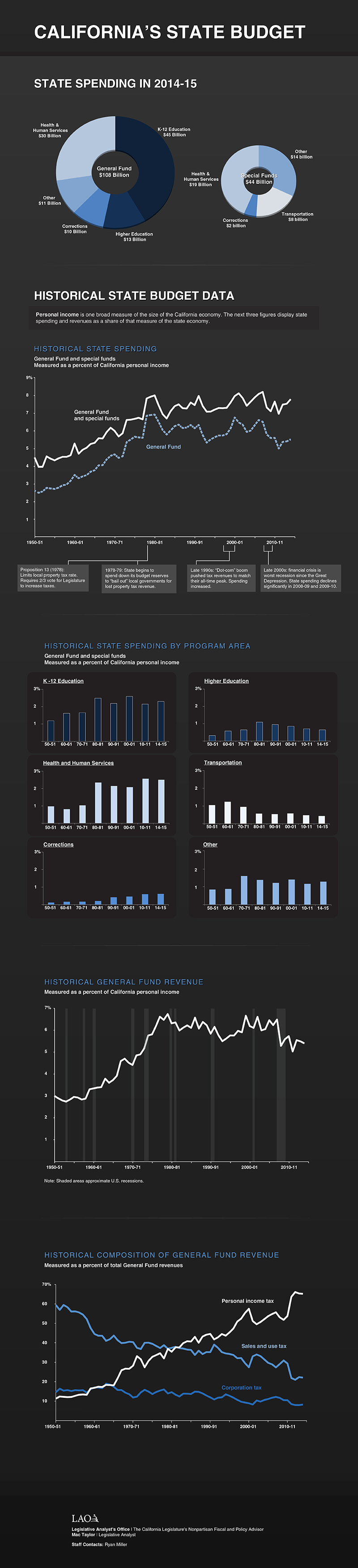 This infographic presents information about the current state budget (2014-15) and compares the level of spending and revenues assumed in the current budget to historical levels since 1950-51. As a share of personal income—one broad measure of the size of the California economy—state spending has been relatively flat since the late 1970s. Spending on health and human services and corrections programs has generally increased over the period, while spending on higher education and transportation programs has generally decreased. Since 1950-51, the personal income tax has replaced the sales and use tax as the predominant source of General Fund revenue.