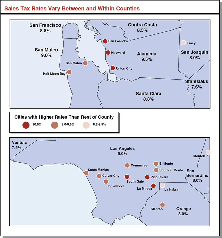 As described in our recent report, Understanding California’s Sales Tax, California’s major population centers include cities and counties with a wide range of sales tax rates. The top panel of the figure below illustrates this variation in part of the Bay Area and some surrounding counties. Several cities in this area have 10 percent rates, while nearby Stanislaus County has a 7.6 percent rate—one-eighth of a cent above the minimum. The bottom panel of the figure displays sales tax rates in the Los Angeles region. Here, Ventura County has the lowest rate—7.5 percent—while three cities in Los Angeles County have 10 percent rates.