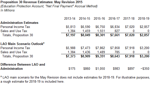 Proposition 30 was approved by voters in 2012 and temporarily increases both personal income tax (PIT) rates for very high-income Californians and sales and use tax (SUT) rates statewide. Below, we summarize the May Revision estimates for Proposition 30 revenues in both the administration's revenue estimates and our own multiyear main scenario revenue outlook. With our office's higher capital gains estimates for 2014 and later years, our Proposition 30 estimates also are higher than the administration's.