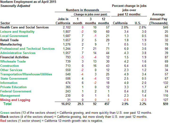 Key Data Points. The EDD jobs report showed that the state's official unemployment rate dropped from 6.5% in March to 6.3% in April. Nonfarm payroll jobs increased by 29,500 from March to April. Since April 2014, one year ago, nonfarm payroll jobs in the state are up by 457,300 (2.9%). As shown in the summary figure below, California's rate of nonfarm job growth over the past 12 months continues to outpace the nation's. Of the 18 job sectors we track on a monthly basis, California's rate of job growth surpassed the nation's over the past year in 13, which is similar to last month's numbers. The technology-heavy professional and technical services sector continues to show strong growth, as does construction.