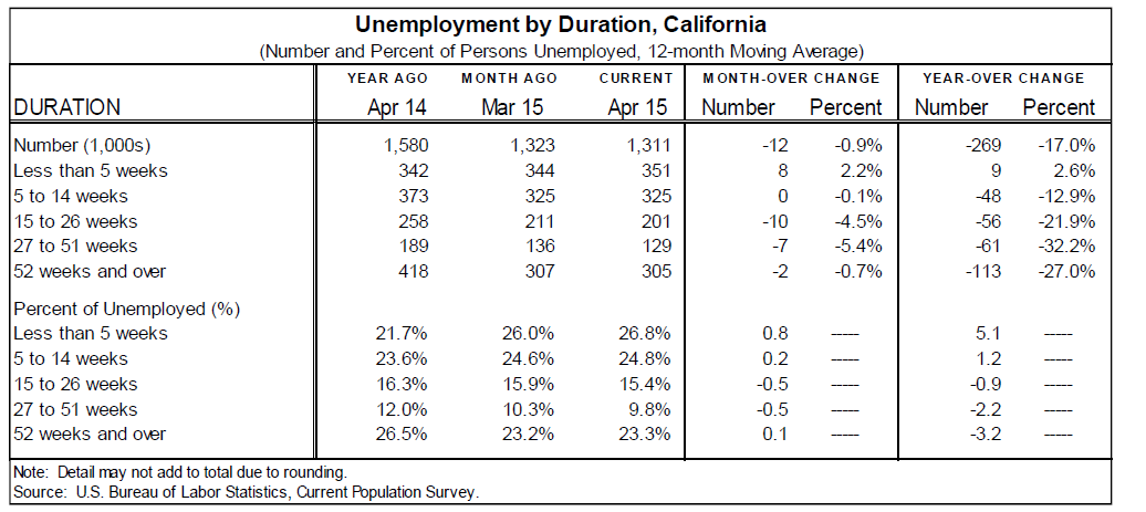 Other Job Market Metrics. As shown below, the prevalence of long-term unemployment in the state continues to drop. Over the past year, using a 12-month moving average, the number of Californians classified as unemployed for 27-51 weeks has dropped by 32.2%, while the number unemployed for 52 weeks or more has dropped by 27%. (The following tables are excerpted from EDD's monthly California Labor Market Review.)