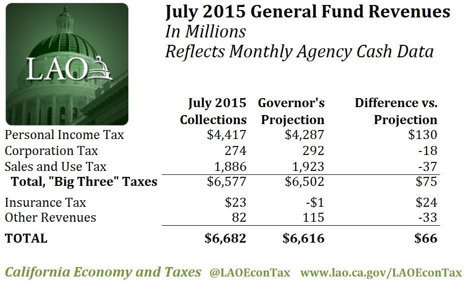 Personal Income Taxes Above Governor's Projections. Personal income tax collections in July are reported to have been $130 million above the Governor's projections for the month, as incorporated in the 2015-16 state budget plan (which was passed in June). July income tax collections largely consist of withholding from employees' paychecks, and gains in withholding (up by more than 10% over monthly totals from July 2014) were largely responsible for the positive revenue totals. Sales and corporate taxes both were slightly below projections in July. Combined, "Big Three" General Fund tax collections are reported by the tax agencies to have been $75 million above the Governor's projection for the month. (July was the first month of the 2015-16 fiscal year. Agency cash collections for the 2014-15 fiscal year, which ended on June 30, also were above the Governor's projections.)
