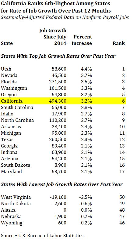 Faster Job Growth Than the U.S. California has been creating jobs at a faster pace than the nation. Over the past 12 months, California has gained 494,300 jobs, up 3.2%. This growth rate ranked 6th highest among the 50 states, according to BLS (trailing Utah at 4.4%, Nevada at 3.7%, Florida at 3.5%, Washington at 3.3%, and Oregon at 3.2%), as shown in the table below. For the nation as a whole, the comparable measure of the number of jobs grew by 2.1% over the last 12 months.