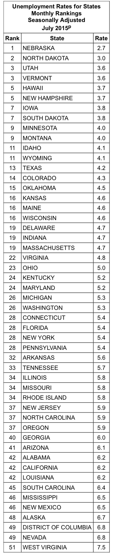 According to BLS, unemployment in California dropped from 6.3% in June to 6.2% in July. The comparable nationwide unemployment rate in July was 5.3%. As shown in the BLS table below, California (along with Alabama and Louisiana, also with 6.2% unemployment rates) still has the nation's 7th-highest state unemployment rate, trailing West Virginia (7.5%), Nevada (6.8%), Alaska (6.7%), New Mexico (6.5%), Mississippi (6.5%), and South Carolina (6.4%). Over the past 12 months, California's unemployment rate has dropped by 1.2 percentage points. Only Rhode Island and Michigan have experienced larger unemployment rate declines over the past year. (We examine July unemployment and labor force participation data for California in more detail here.)