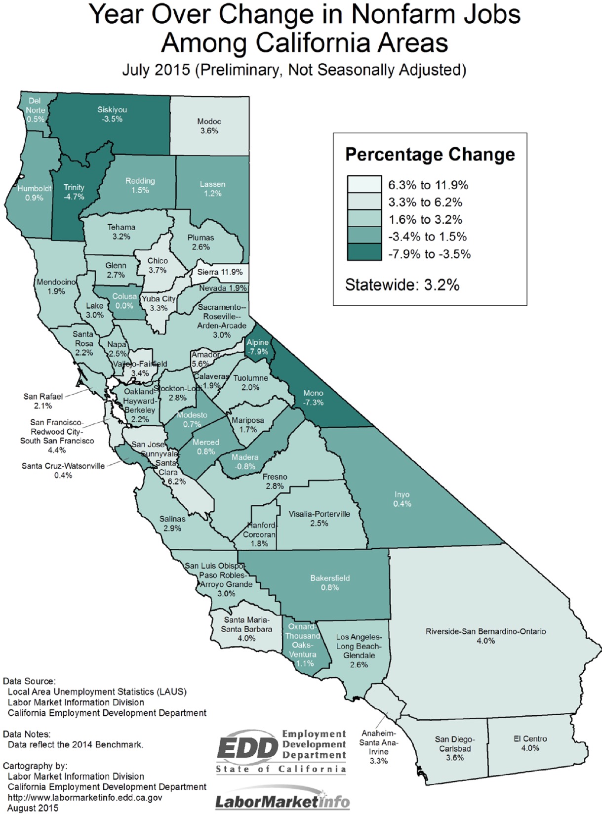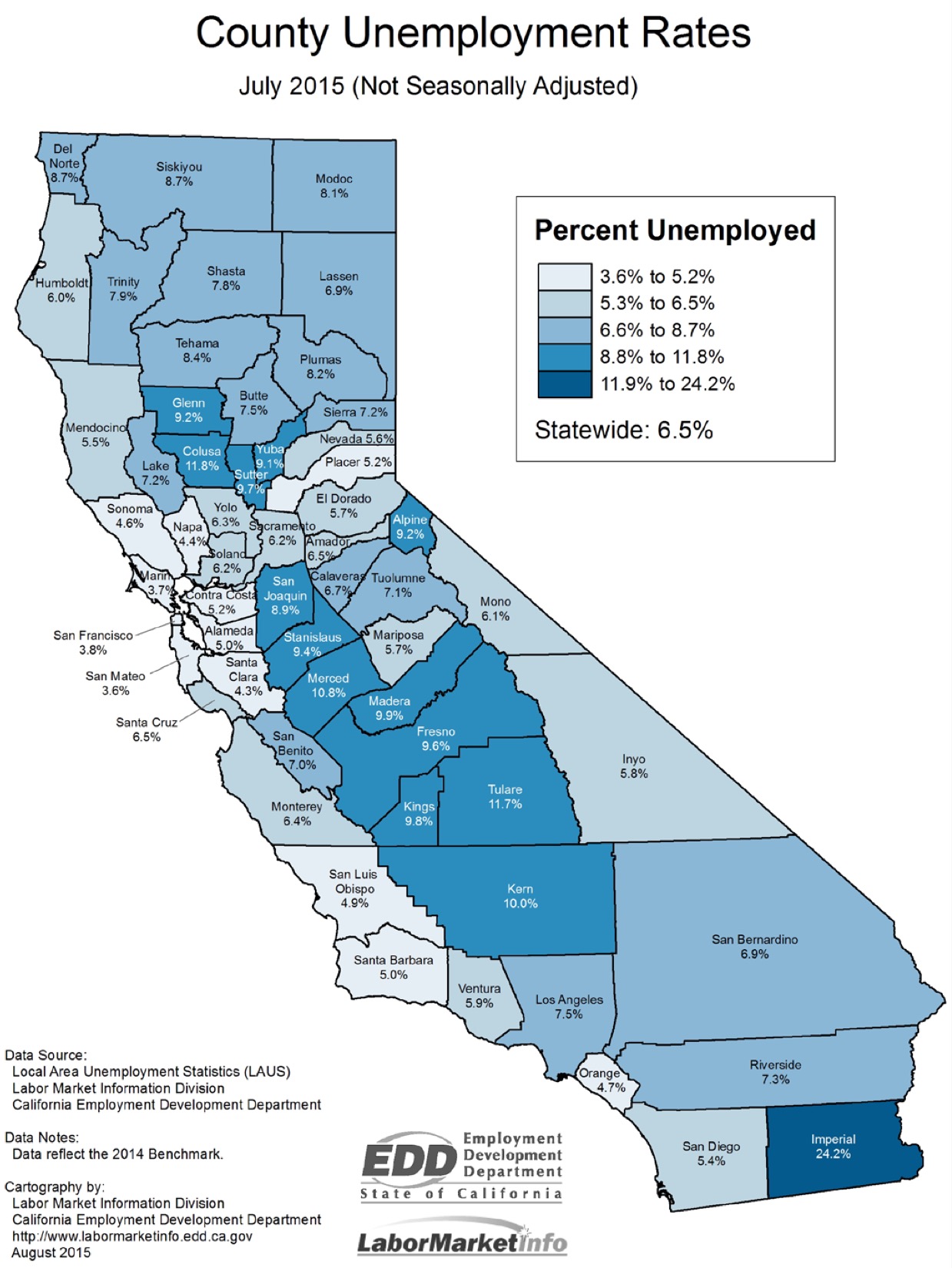 Los Angeles County Leads Statewide Jobless Rate Drop. EDD data shows that the seasonally-adjusted unemployment rate for Los Angeles County declined from 7.5% in June to 7.1% in July, driving the statewide unemployment rate drop. Across the state, unadjusted county unemployment rates ranged from lows of 3.6% in San Mateo County and 3.7% in Marin County to highs of 24.2% in Imperial County and 11.8% in Colusa County. The EDD map below shows unadjusted unemployment rates by county, where lighter shades of blue indicate lower unemployment rates and darker shades of blue indicate higher unemployment rates.