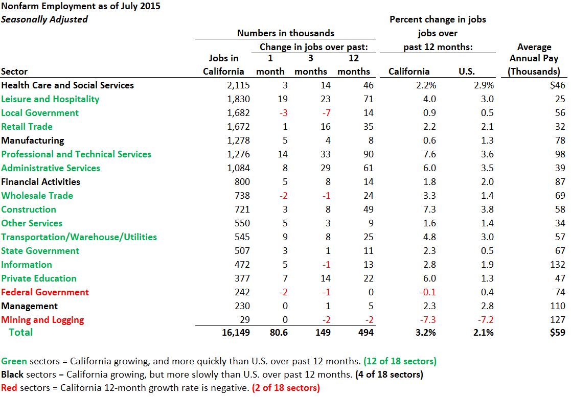 The U.S. Bureau of Labor Statistics (BLS) released summary state jobs data this morning for July 2015. Later, the state Employment Development Department (EDD) released its monthly data for July. Each month, we track California's seasonally-adjusted nonfarm payroll employment growth across 18 economic sectors (described here). As shown below, over the past 12 months, California's job growth has surpassed the nation as a whole in 12 of those 18 sectors, according to EDD data for California and BLS data for the U.S.
