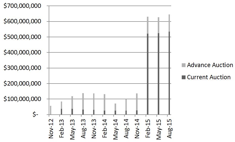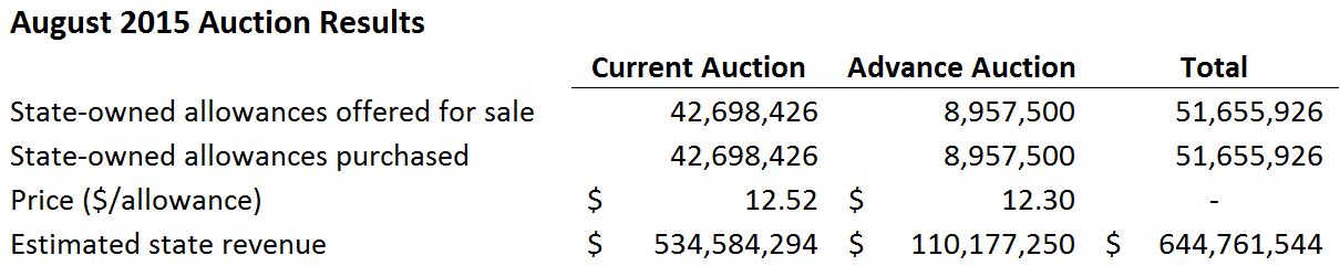 On August 25, 2015, the state released summary results from the cap-and-trade auction conducted on August 18, 2015. Based on the summary results, the state will collect $645 million in cap-and-trade auction revenue from the August auction. The auction included 2015 allowances (sold at the current auction) and 2018 allowances (sold at the advance auction). (The actual amount of state revenue will be determined in a few weeks and will depend on the future exchange rate between U.S. dollars and Canadian dollars. Please see summary results for more details on the process for collecting proceeds.)