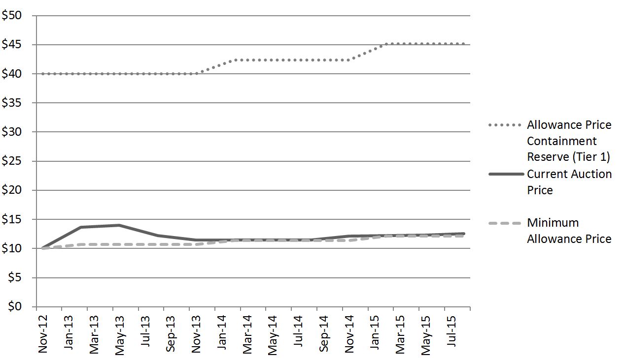 Prices Remain Near Minimum Level. As shown in the figure below, allowance prices continue to be relatively close to minimum prices established by the state. Prices are substantially less than allowance prices for Tier 1 of the allowance price containment reserve. (The allowance price containment reserve contains allowances that are available to be purchased at predetermined prices. It is intended to be a “release valve” to moderate potential spikes in allowance prices above a certain threshold. See here for more detail.)