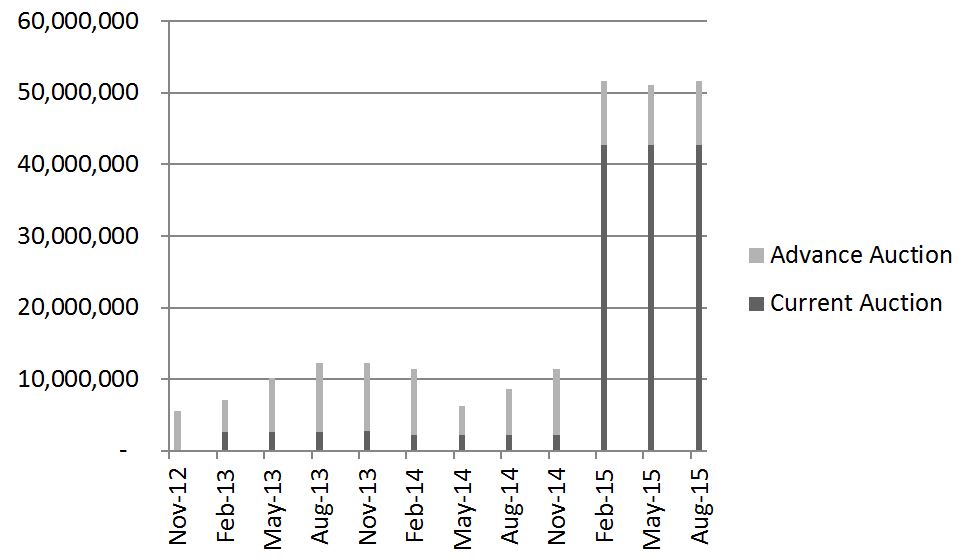 What is the Difference Between the Current Auction and the Advance Auction? The current auction included 2015 vintage allowances and the advance auction included 2018 vintage allowances. The vintage year indicates when the allowance can be used to comply with the cap-and-trade regulation. For example, a 2015 vintage allowance can be used to cover an entity’s emissions in 2015 or a later year, but it cannot be used to cover emissions that occurred in 2014. Similarly, a 2018 vintage allowance cannot be used to cover emissions that occurred prior to 2018.