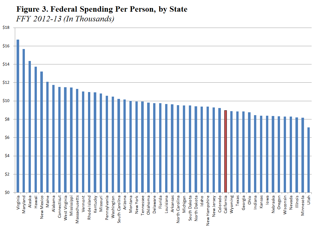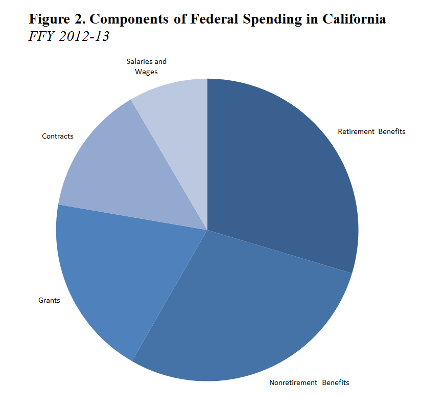 California Receives More Federal Money Than Any Other State. In FFY 2012-13, California received $343 billion in federal spending. As shown in Figure 1, that amount was more than any other state received and about $100 billion more than the next largest recipient of federal funds, Texas. In absolute terms, California receives the largest quantity of federal funding because it has the nation’s largest population.
